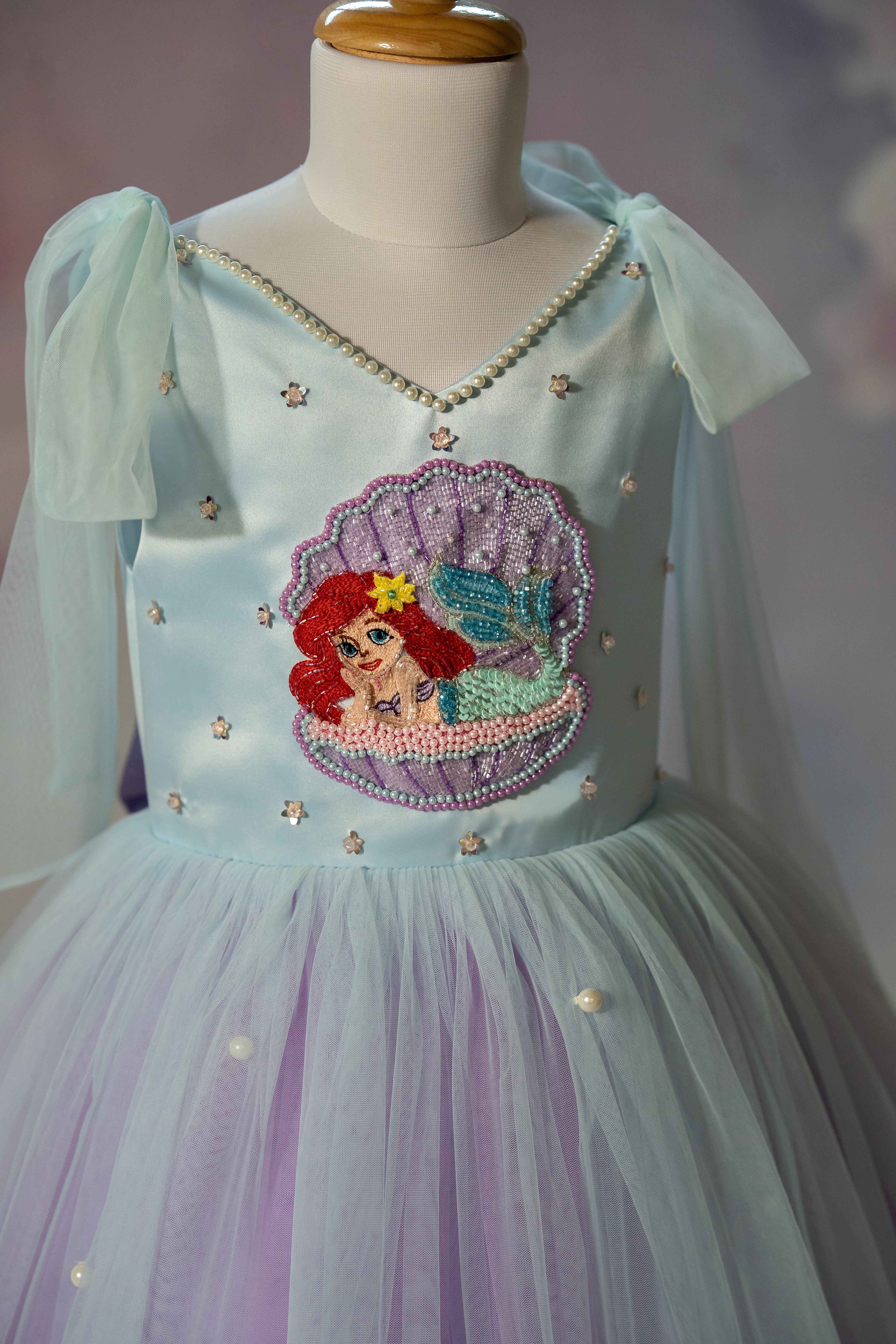 A tie-up dress with intricate mermaid hand embroidery, pearl detailing along the neckline, and a dual color flare with pearls all over.