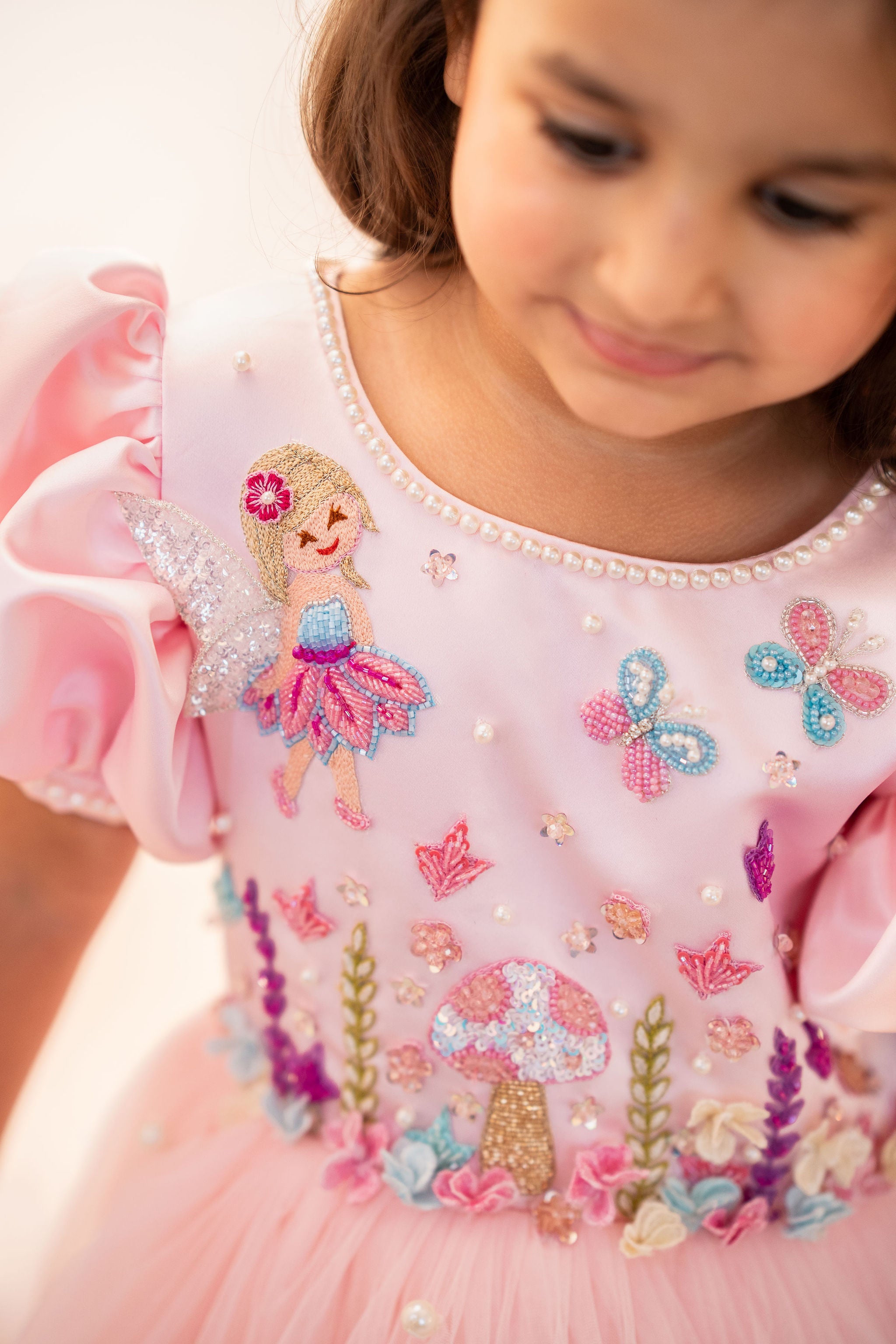 A pink Fairy Garden dress featuring hand embroidery throughout, a scalloped flare finished with pearls, and a beautifully hand-embroidered detachable butterfly at the back.
