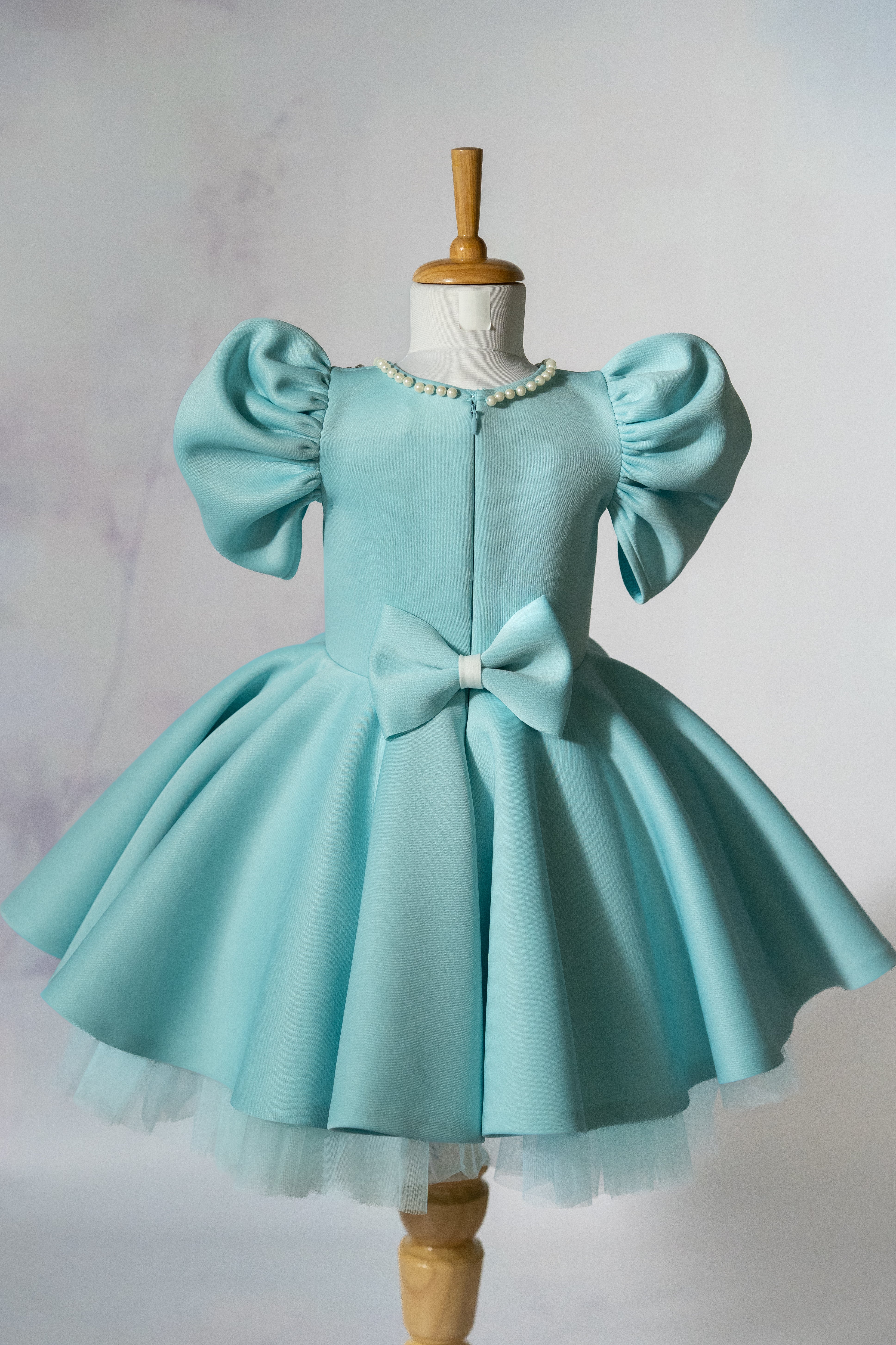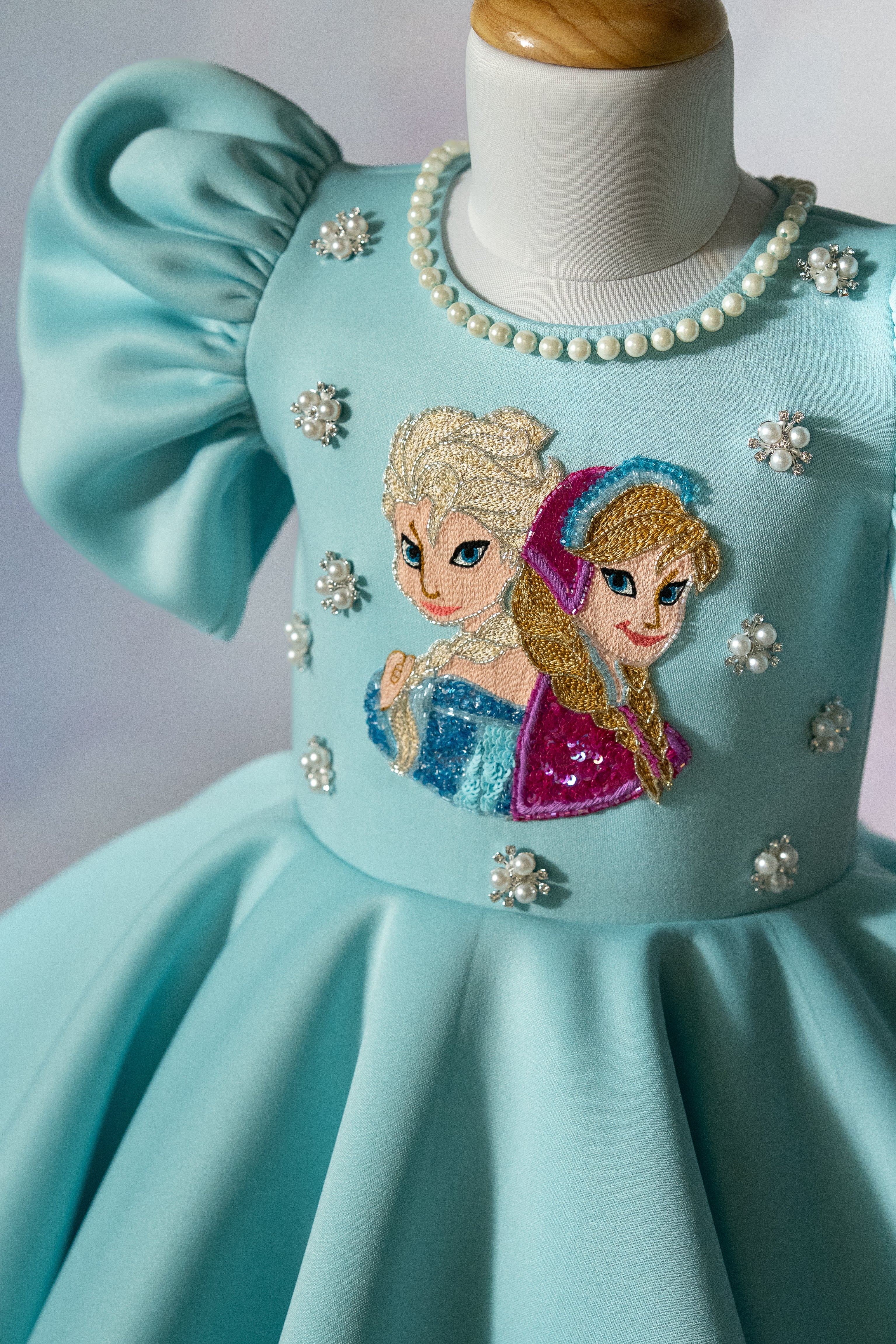Blue scuba dress with puff sleeves, intricate frozen embroidery, and delicate pearl accents in a voluminous flare.