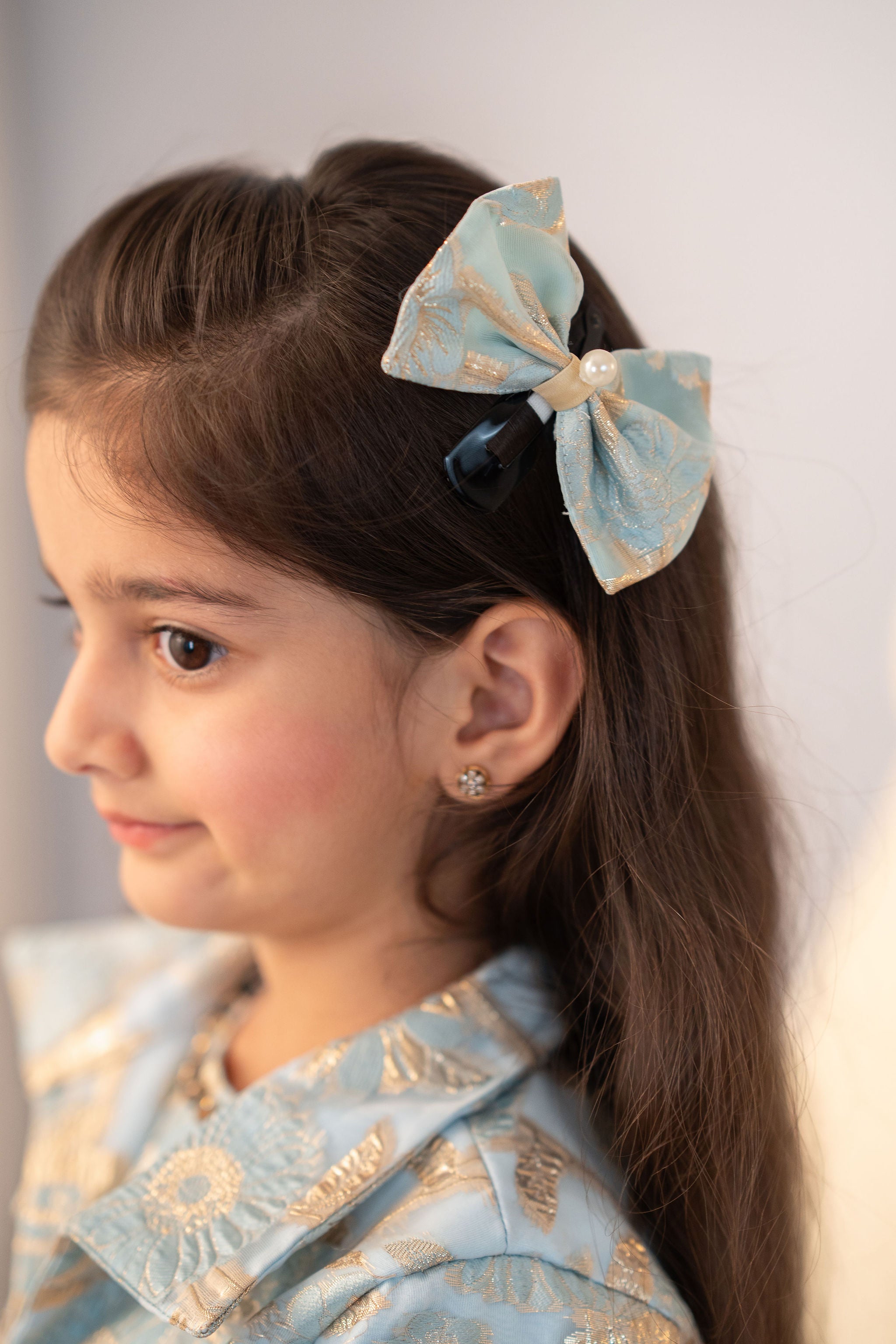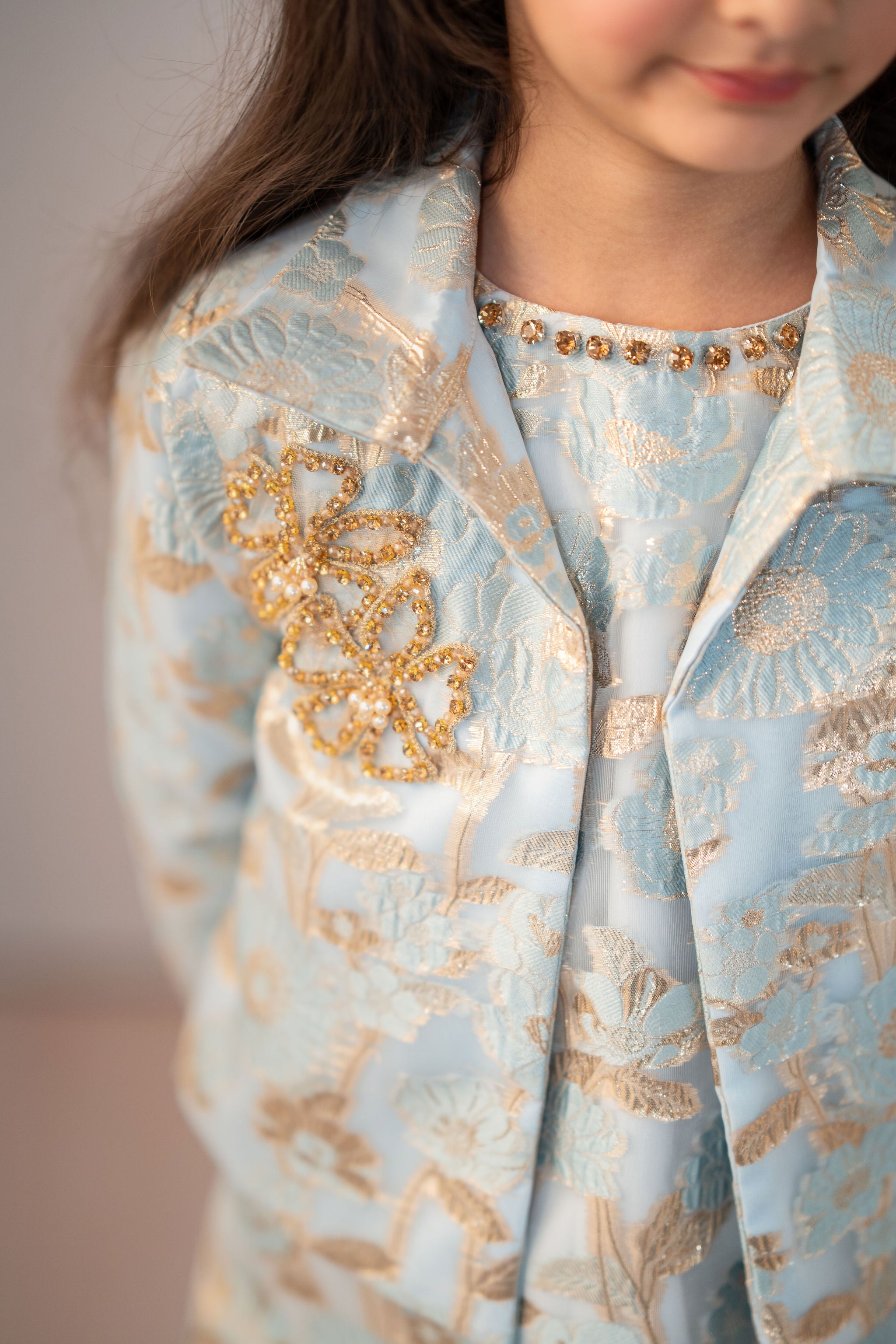 A classic blue jacquard A-line dress with stone detailing along the neckline and folded sleeves, paired with a matching jacquard jacket featuring intricately hand-embroidered 3-D golden flowers