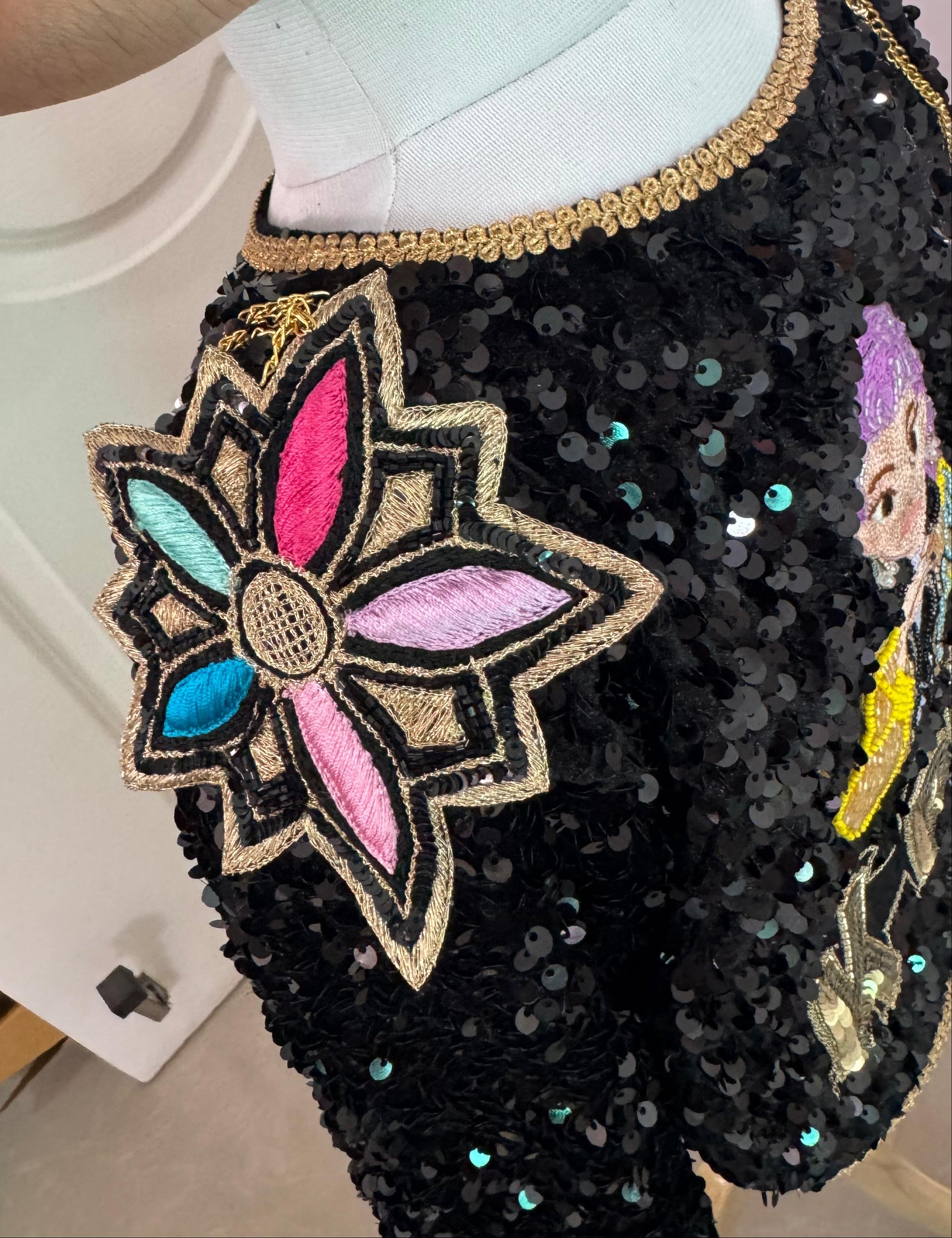 A k-Pop inspired sequined velvet jacket with intricate Rumi embroidery on back.