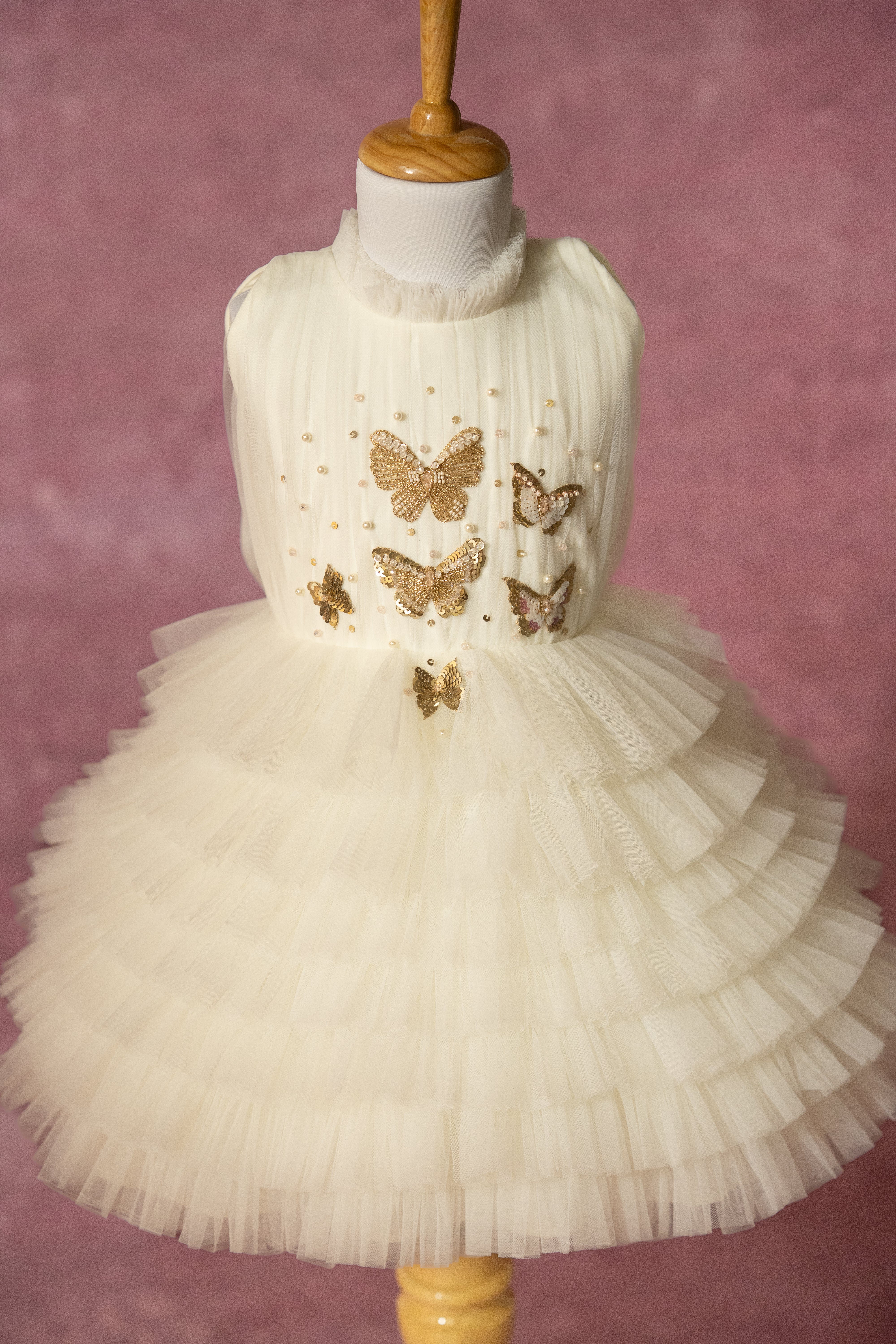 Layered off white tulle dress with a draped bodice, high neck and hand embroidered gold butterflies.