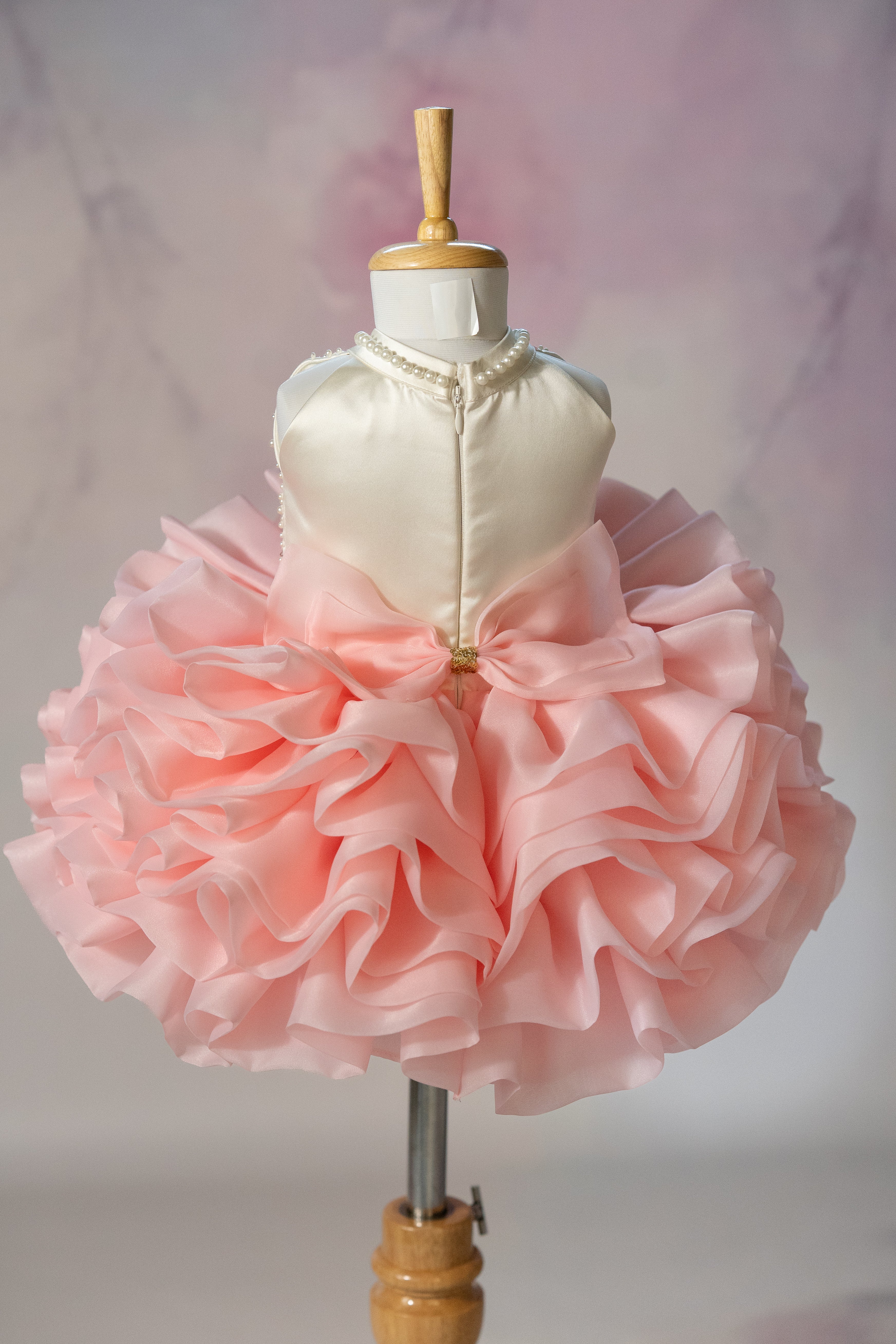 Layered organza puffy dress with intricately hand embroidered princess on an off white bridal satin halter bodice.