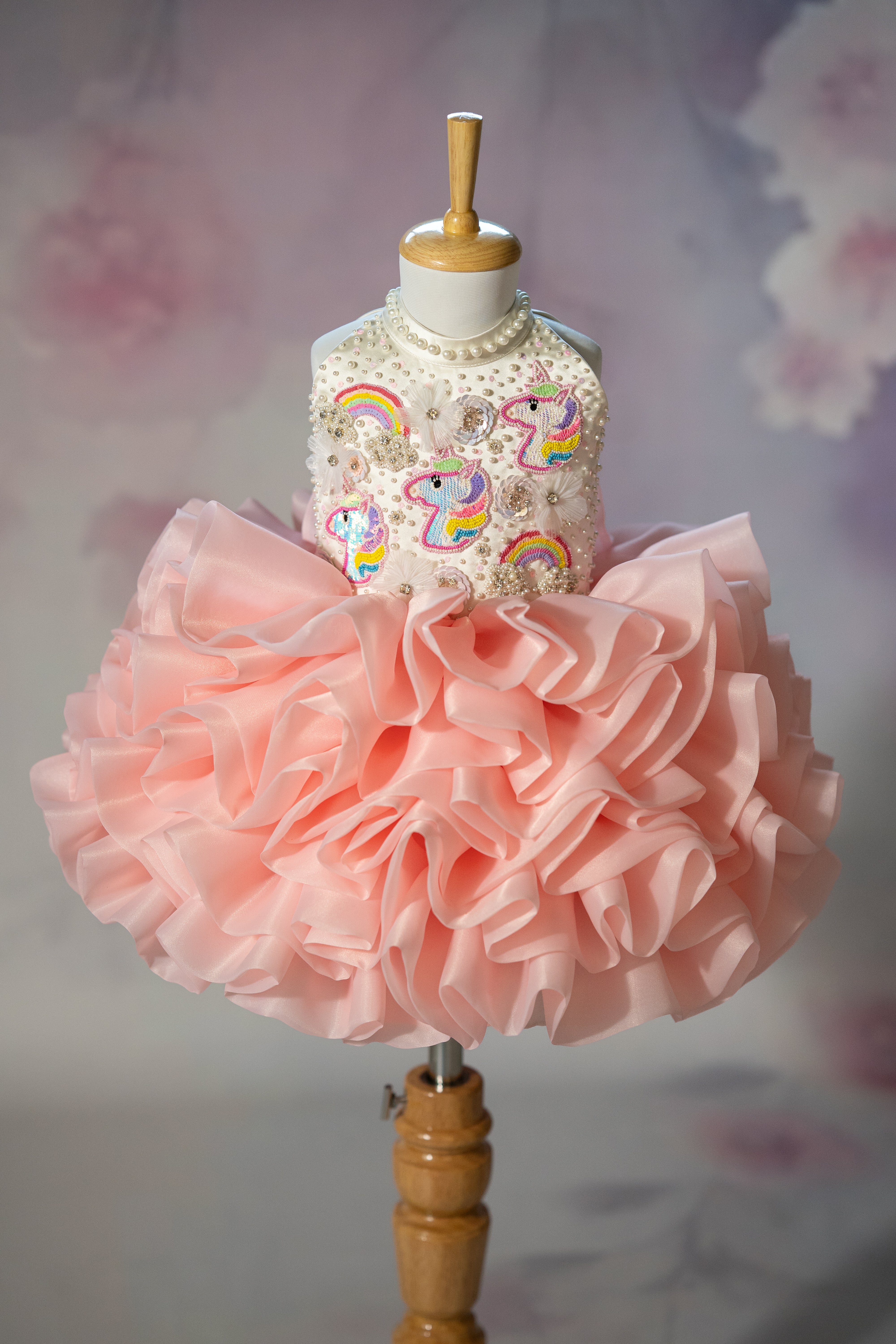 Layered organza puffy dress with intricately hand embroidered unicorn on an off white bridal satin halter bodice.