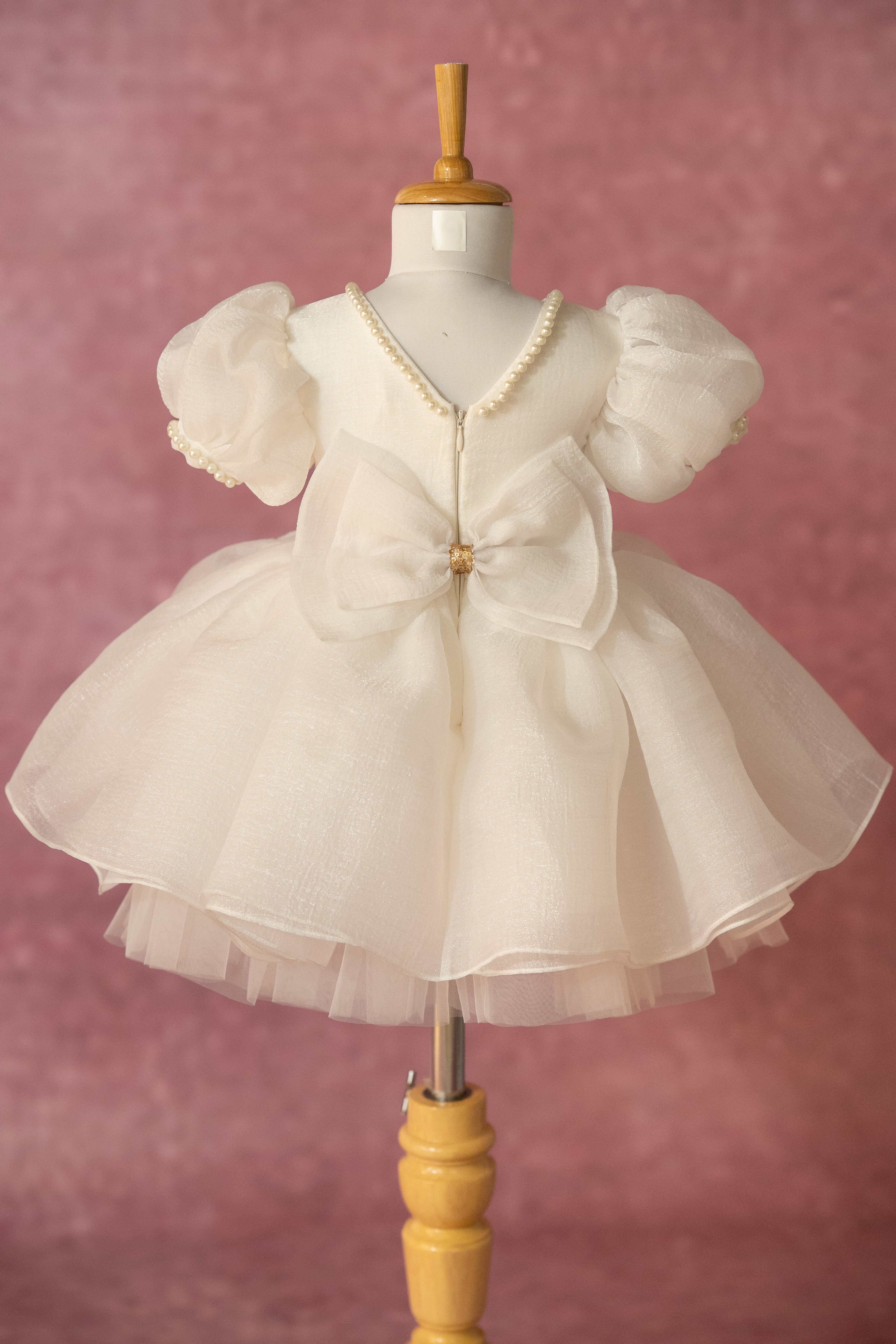 A fluffy under the sea themed dress made with off white textured shimmer organza fabric. Adorned with hand embroidered fish, jelly fish and shell.